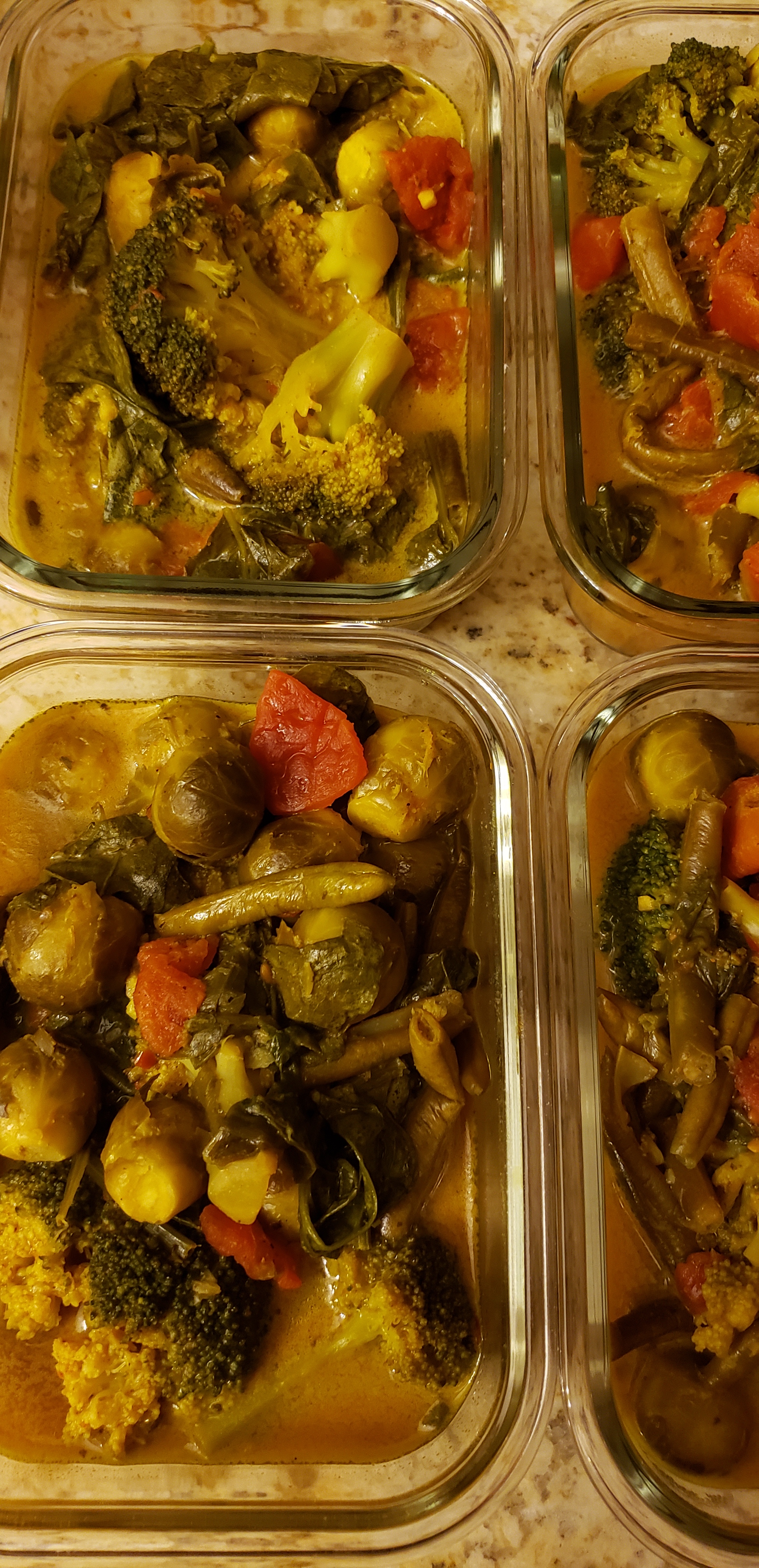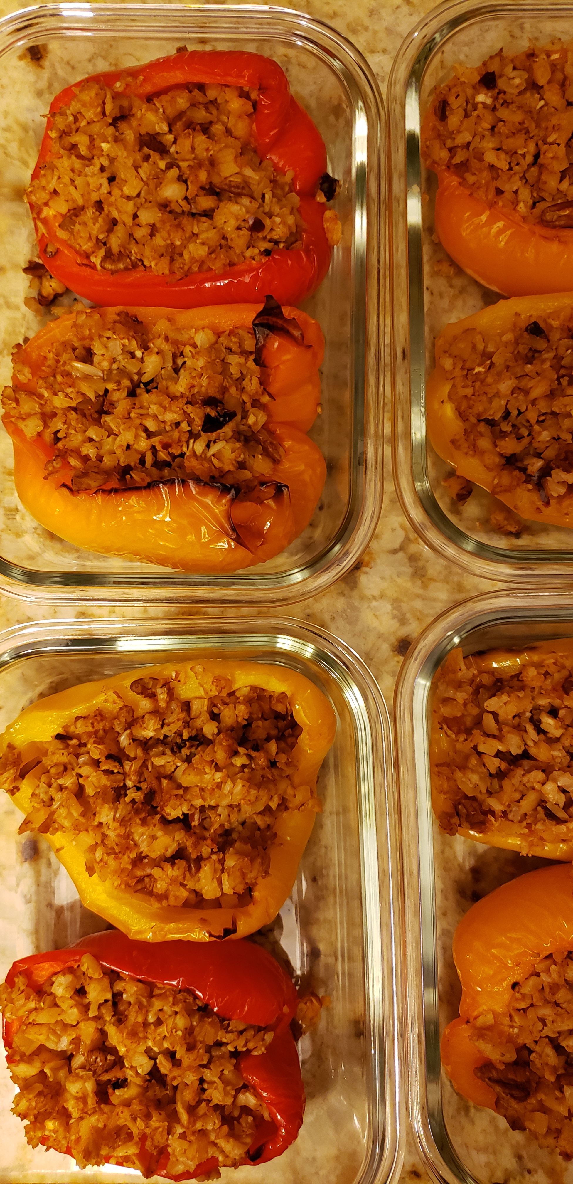 PM: 1) Simple salad with my favorite tomato “kumato” and pumpkin seeds also delicious almond butter turmeric dressing from Trader Joes . 2) Vegetable curry (with broccoli, brussel sprouts, green beans, spinach, tomato – no starchy vegetables or chickpeas) 3) Stuffed Peppers (with seasoned cauliflower rice and pecans) 4) Raw taco salad (not shown).