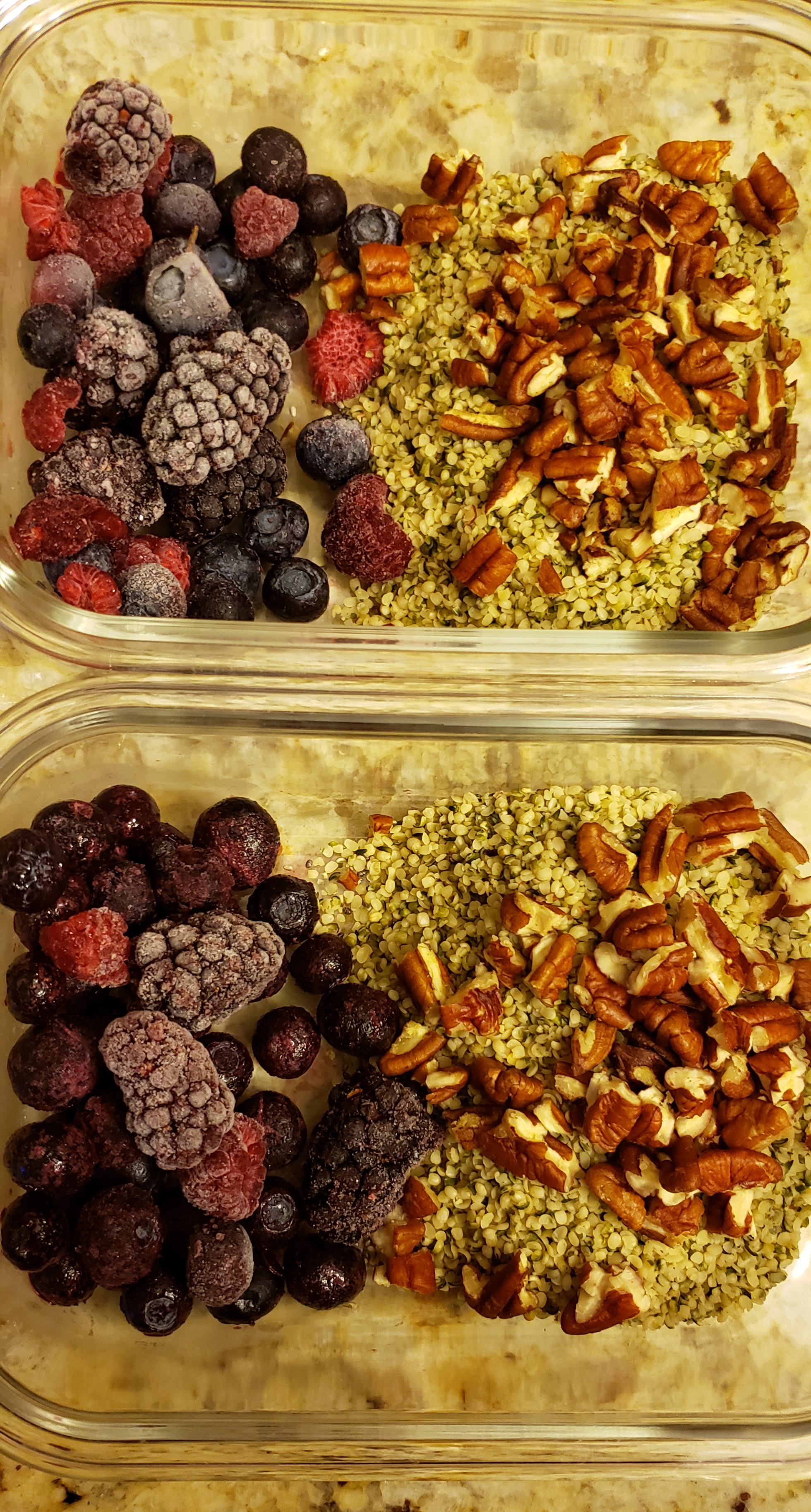 AM and Snacks: 1) Hemp Noatmeal (added frozen fruit and pecans this time). I will add 1/2 cup coconut milk in AM. 2) Nuts (Pistachio, Macadamia, and Peanut). 3) Celery and Almond Butter w/ peanuts. 4) Seed Crackers (GF from Trader Joes). 5) Snickerdoodle Cookies (GF & Vegan)