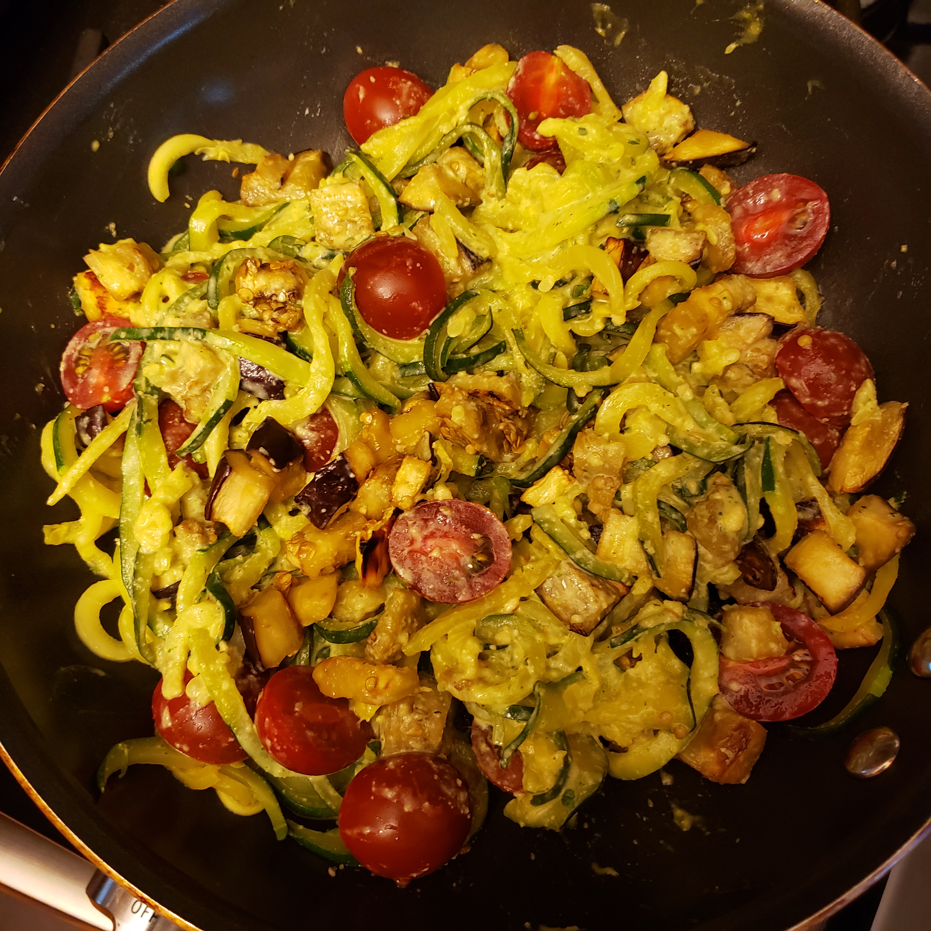 PM: I roasted eggplant and served it two ways 1) with zucchini noodles topped with cashew basil pesto and fresh tomato 2) with pesto.